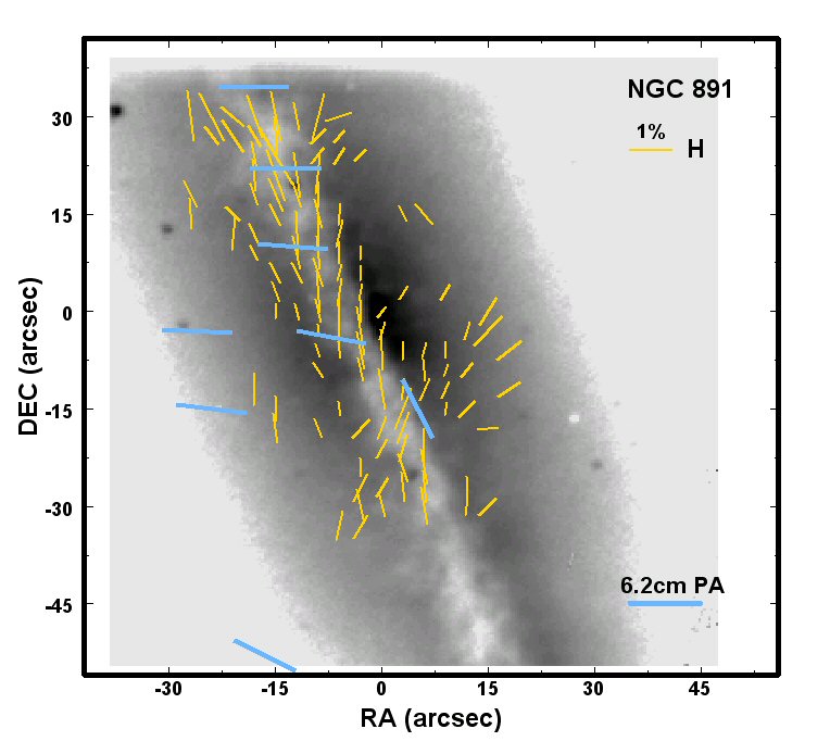 NGC 891. The yellow polarization vectors are in the H band, the blue polarization vecotrs are from radio sychrotron measurements by Sukumar and Allen (1991, ApJ, 382, 100). If both methods are measuring the same magnetic field geometry, they will be perpendicular to one another. Note that the magnetic field in the disk clearly departs from a simple planar field in the North and is at an angle of about 15 degrees to the disk of the galaxy.